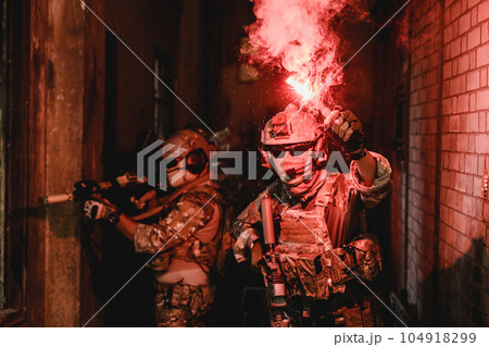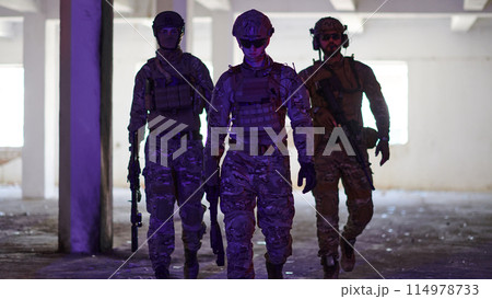 A professional soldier undertakes a perilous mission in an abandoned building illuminated by neon blue and purple lights