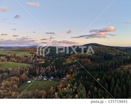 pink sunset landscape, warm pastel glow casts serene ambiance across forested hills and distant slopes