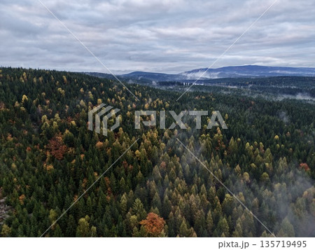 Drone Captures Cloudy Forest Scene Mood, Atmospheric Image Of Fog Drifting Over Treetops From Above