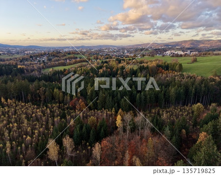aerial view of rolling hilltops featuring autumnal canopies and varied vegetation for creative projects