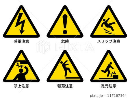 注意マーク 感電注意 スリップ注意 頭上注意 転落注意 足元注意などの警告マークのイラストセット