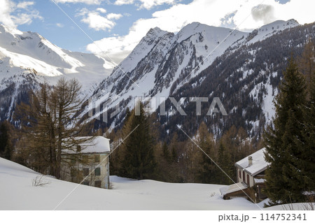 Beautiful winter landscape. Two buildings among tall green spruce trees on background of steep woody mountains covered with white deep snow under bright blue sky on sunny frosty day.