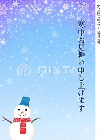 寒中見舞い 雪だるまと雪の結晶 はがきテンプレート 縦長