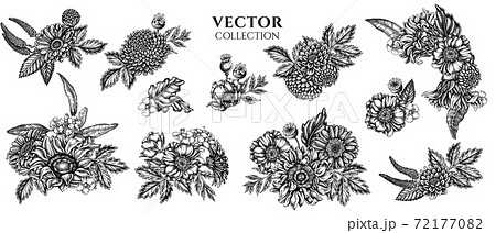 Vector set of hand drawn black and white poppy flower, gerbera, sunflower, milkweed, dahlia