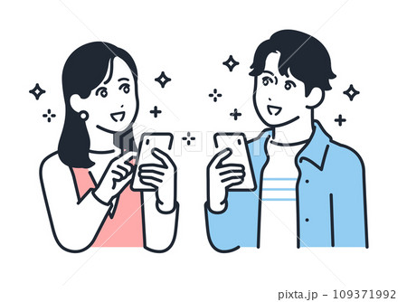スマートフォンを持って目を輝かせる若い男女のシンプルなベクターイラスト素材