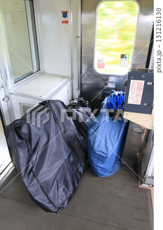 自転車のある風景 列車内に自転車を収納した輪行バックがある風景
