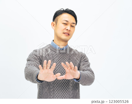 嫌がるカジュアルウェアのミドル男性