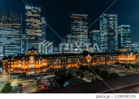東京駅舎と丸の内高層ビル群の夕景 東京都千代田区