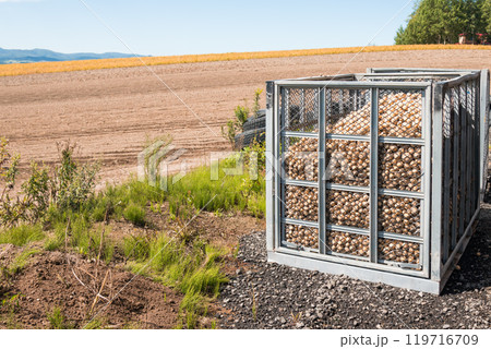 【美瑛町 コンテナに詰められた収穫したジャガイモ】