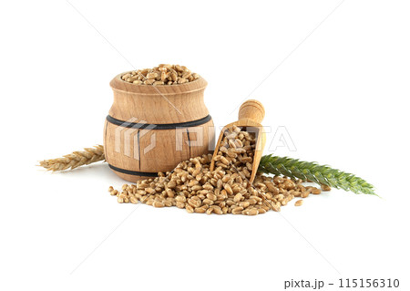 Wooden barrel and scooper filled with wheat grains next to wheat ears on white background