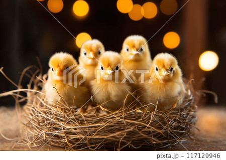 Small chickens in a nest on a dark background with bokeh lights for Easter