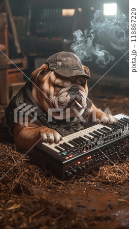 The Creative Bulldog at Work Crafting Unique Beats in the Rustic Barn Environment