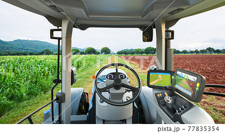 Autonomous tractor working in corn field, Future technology with smart agriculture farming concept