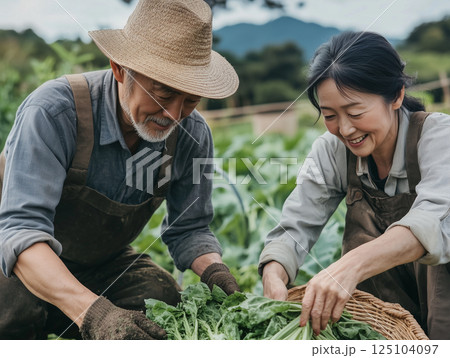 畑で農作業をする高齢夫婦(日本の農村風景)