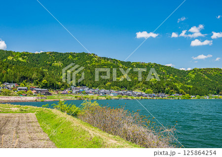 初夏の余呉湖畔川並集落と新緑の山 滋賀県長浜市余呉町