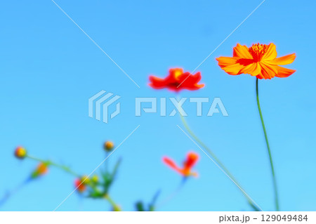 爽やかな快晴の青空と鮮やかなオレンジ色の黄花コスモス
