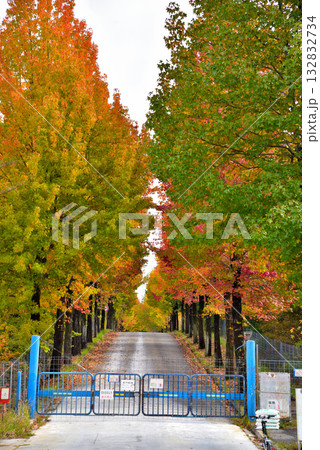 《愛知県》長久手市 愛知県農業総合試験場の紅葉したモミジバフウ並木