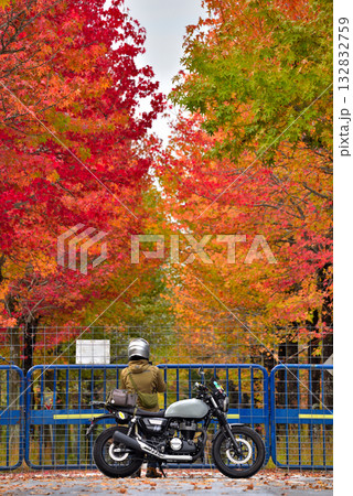 《愛知県》長久手市 愛知県農業総合試験場の紅葉したモミジバフウ並木とバイク