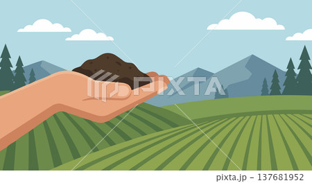 Hand supporting fertile soil above farmland landscape representing growth agriculture environment
