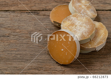 Jaggery on wooden table with copy space. Organic sugar made from palm or coconut.