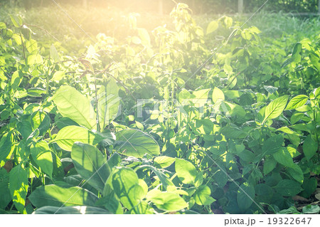 Coriandrum spp on green nature background and morning sunlight at organic farm. Closeup and copy space. Concept of medicinal plants or herb.
