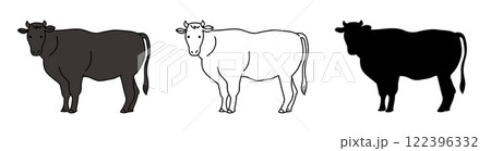 黒い牛の手書きベクターイラストセット。黒毛和種の牛を漫画風に描いたアイコン。