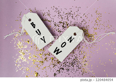 Two tags with the words buy and now are hanging from a string