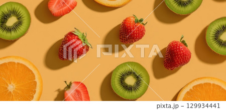 Geometric Fruit Layout with Sliced Kiwi, Oranges, and Strawberries on Orange Background