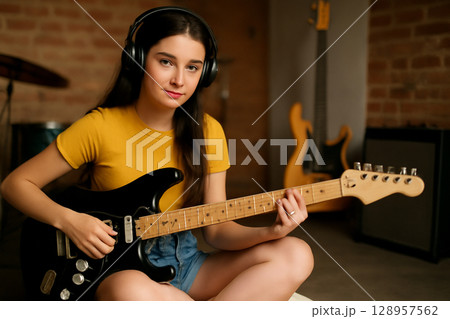 AI generated image of a young woman playing a black electric guitar in a music studio. She has long hair and wears headphones, dressed in a casual red T-shirt, denim shorts, and white boots