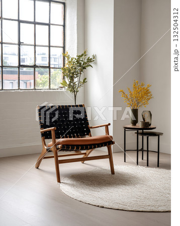 A stylish rattan armchair with a brown leather cushion sits on a jute rug next to a window, accompanied by a small black side table and a large houseplant.