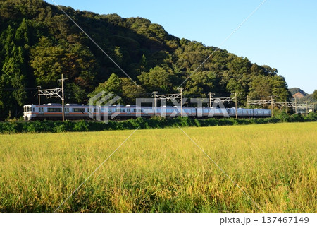 秋空の下、稲穂が実る田園を走るJR東海313系電車
