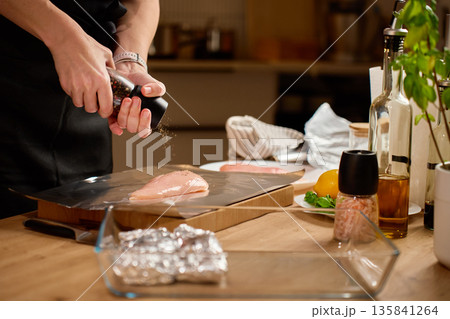 Woman seasoning raw chicken fillets on foil at kitchen table