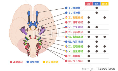 12脳神経の運動神経と感覚神経と副交感神経で色分けしたイラスト