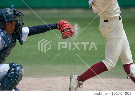 野球の試合中にピッチャーが投げてバッターが空振りしキャッチャーのミットにボールがズバッと収まり土煙が