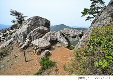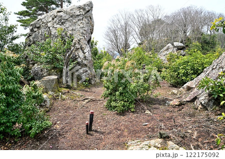 丹波市鐘ヶ坂の鐘ヶ坂公園の入り口付近から見える金山城跡と夕日があたる鬼の架け橋の岩場