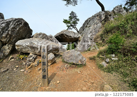 丹波市鐘ヶ坂 の金山城跡の手前にある 鬼の架け橋 と木々が青空に映える