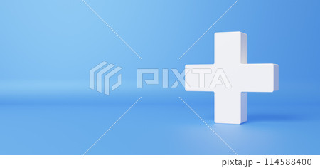 青い背景に白い十字。正面。コピースペース。3D(横長)