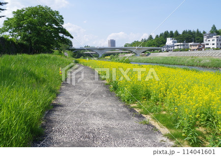 菜の花に覆われた広瀬川の川原と大橋の景色
