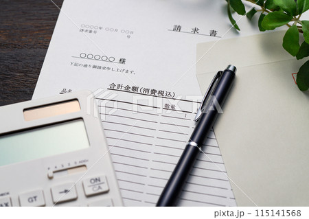 契約書在中の封筒と電卓のイメージ。ビジネス手続きや書類管理の概念。