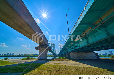 夏の東京都大田区多摩川2丁目の河川敷から多摩川に架かる多摩川大橋と多摩川専用橋を見る