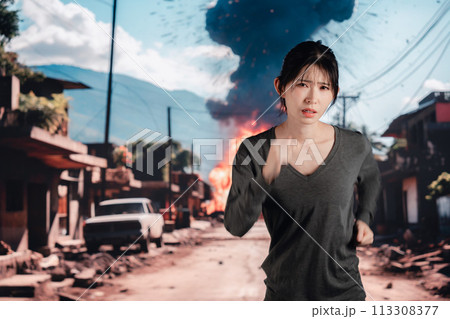 爆発から逃げる若い女性