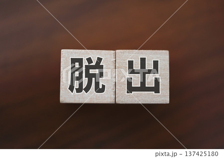 脱出を表す文字ブロックと木製背景。