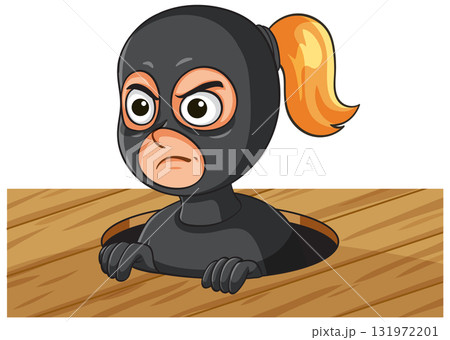 Cartoon Female Burglar Emerging From Wooden Floor Trapdoor