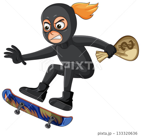 Masked Thief Skateboarding Over Wooden Fence With Money Bag