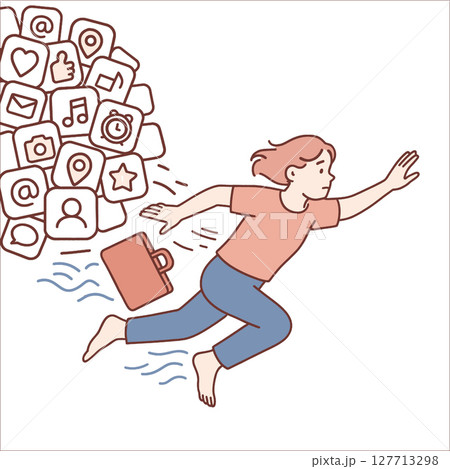 Person running away from social media icons, seeking freedom and simplicity in life