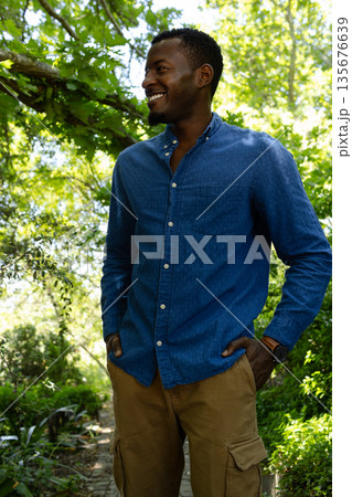 Smiling man in casual outfit enjoying nature walk in lush green garden