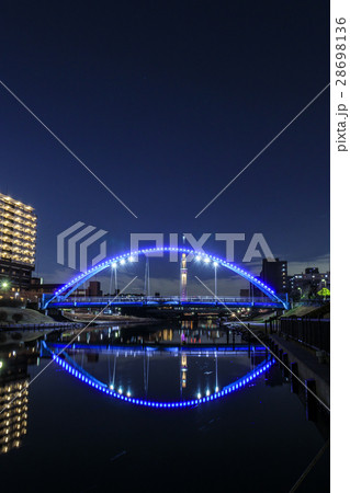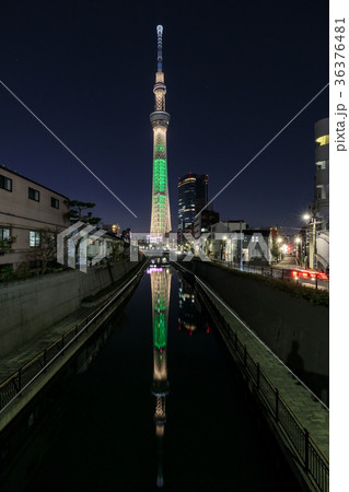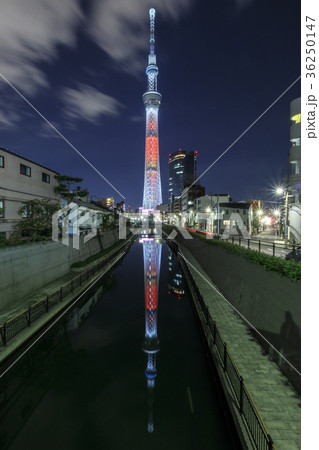 都市風景 ライトアップした東京スカイツリーが川面に映る逆さツリーの夕景