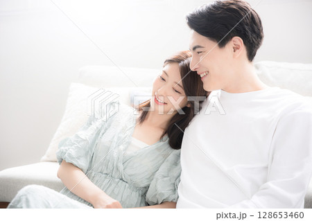 逆光の明るいリビングでリラックスする寄り添う若いカップル 夫婦や新婚さんのイメージ