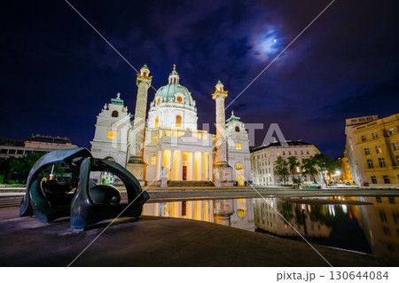 Magical evening view of the St. Charles Church (Karlskirche). Location place Karlsplatz in Vienna. Austria, Europe.