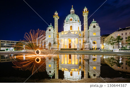 Magical evening view of the St. Charles Church (Karlskirche) and fire show. Location place Karlsplatz in Vienna. Austria, Europe.